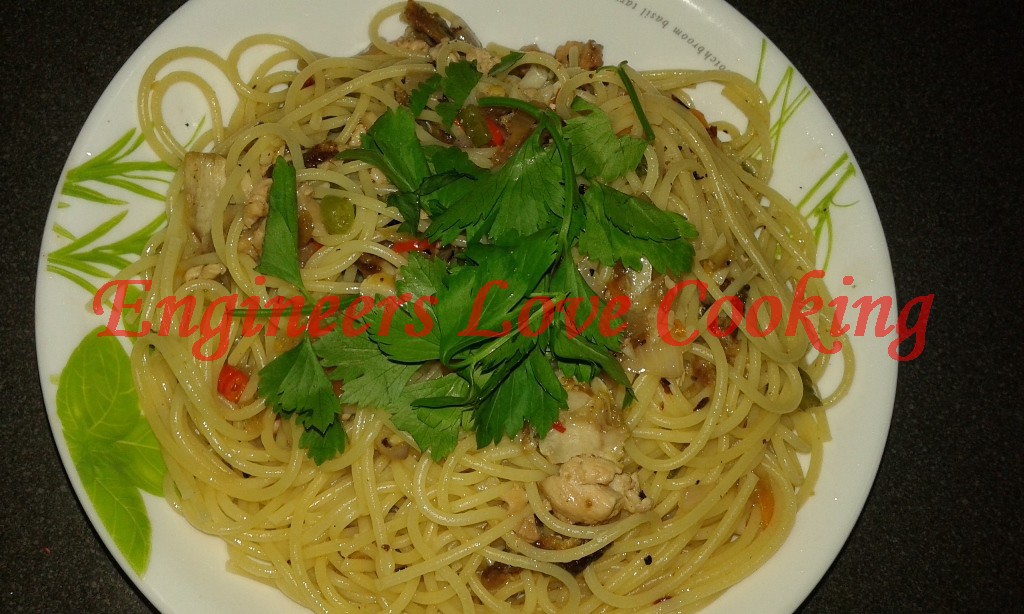 - Tos spaghetti dan masukkan ke dalam bahan yang ditumis dan digaul rata dan sebati.